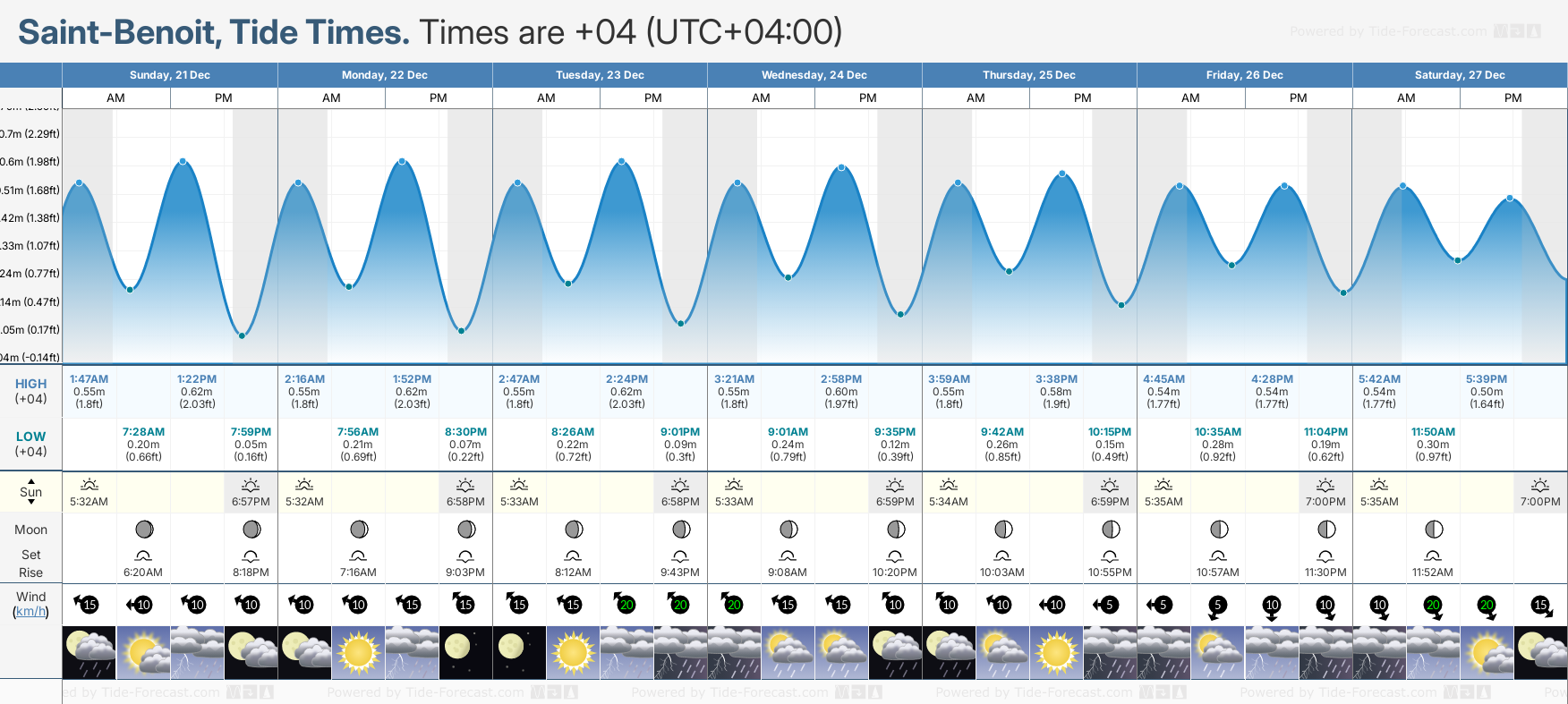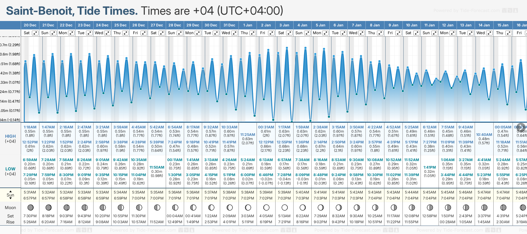 December and January Tide charts for Saint-Benoit: The tide charts below show the height, time and date of high and low tides for the next 30 days.