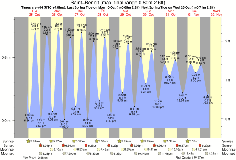 Tide Times are +04 (UTC +4.0hrs). Last Spring High Tide at Saint-Benoit was on Thu 04 Dec (height: 0.70m 2.3ft). Next high Spring Tide at Saint-Benoit will be on Mon 22 Dec (height: 0.62m 2.0ft).