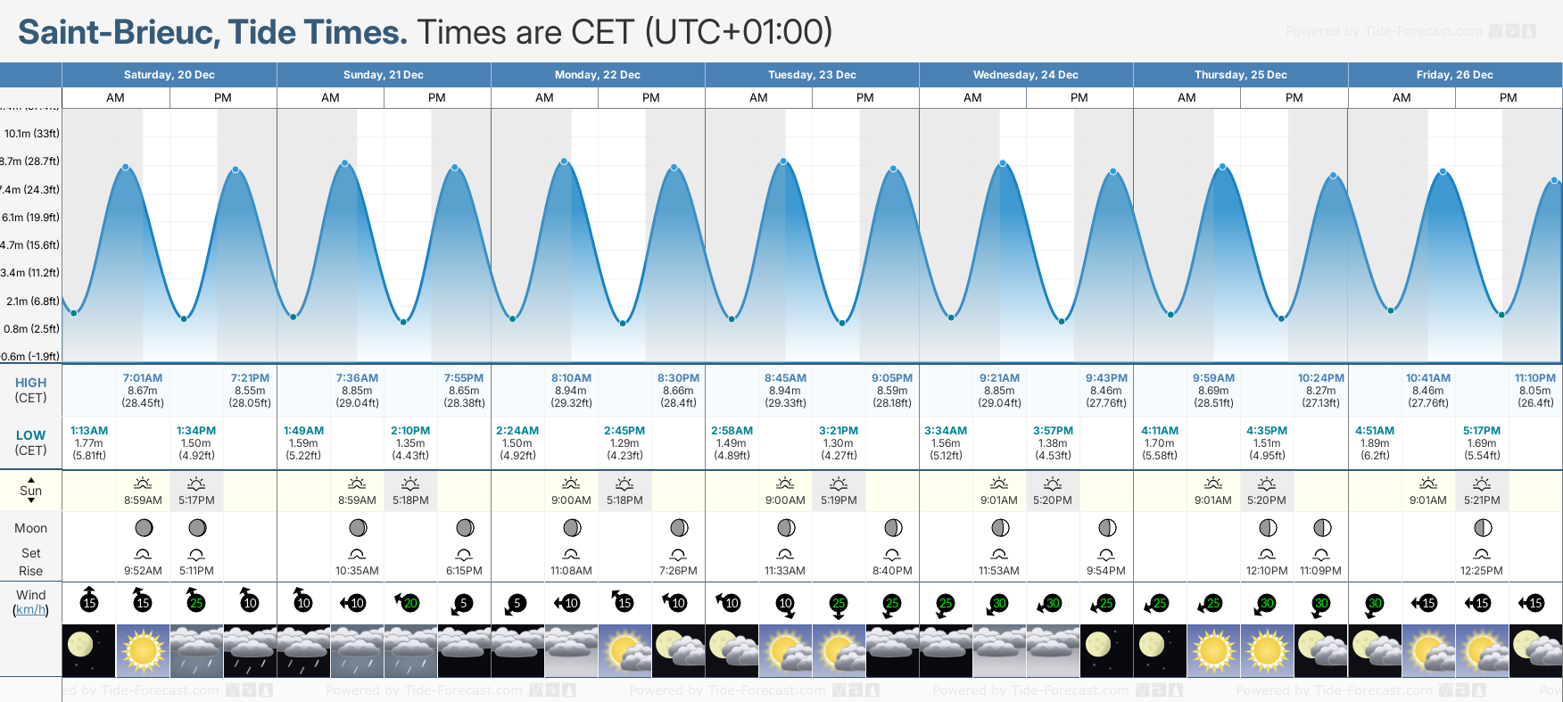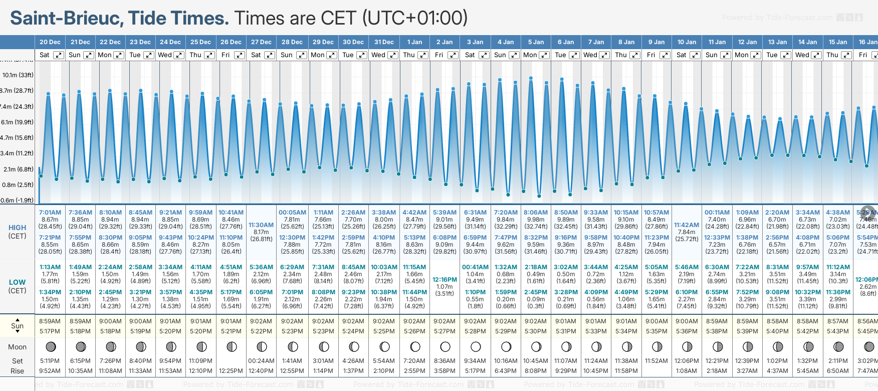 December and January Tide charts for Saint-Brieuc: The tide charts below show the height, time and date of high and low tides for the next 30 days.