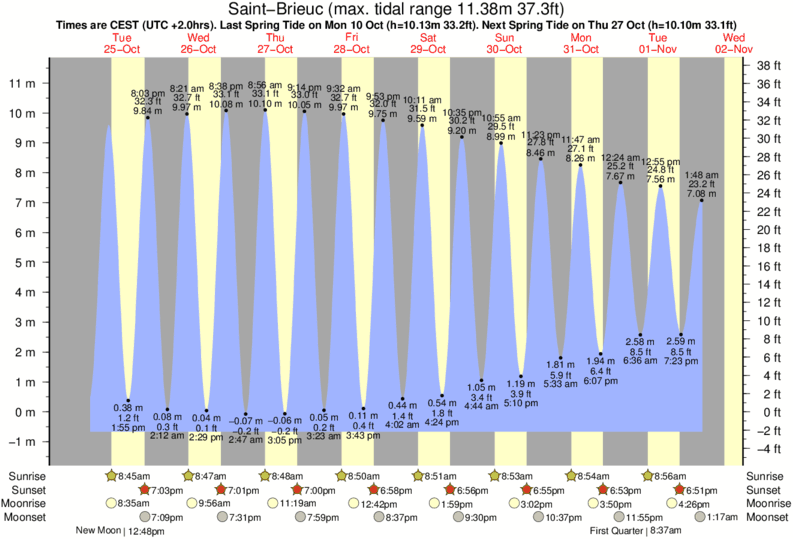 Tide Times are CET (UTC +1.0hrs). Last Spring High Tide at Saint-Brieuc was on Sat 06 Dec (height: 10.18m 33.4ft). Next high Spring Tide at Saint-Brieuc will be on Mon 22 Dec (height: 8.94m 29.3ft).
