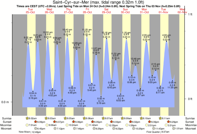 Tide Times are CET (UTC +1.0hrs). Last Spring High Tide at Saint-Cyr-sur-Mer was on Sun 07 Dec (height: 0.29m 1.0ft). Next high Spring Tide at Saint-Cyr-sur-Mer will be on Sun 21 Dec (height: 0.25m 0.8ft).
