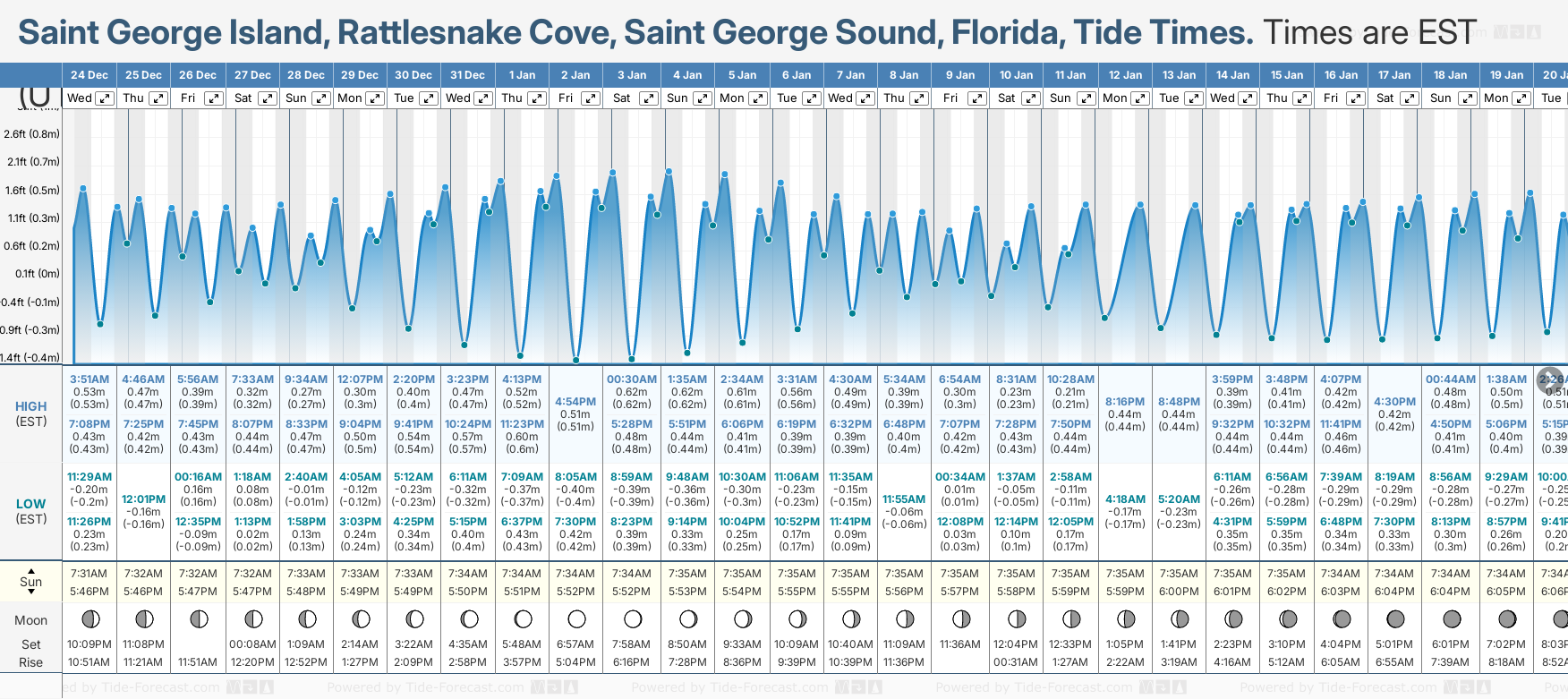 December and January Tide charts for Saint George Island, Rattlesnake Cove, Saint George Sound: The tide charts below show the height, time and date of high and low tides for the next 30 days.