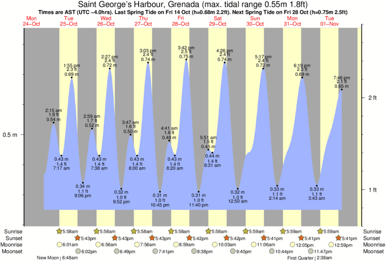 Tide Times are AST (UTC -4.0hrs). Last Spring High Tide at Saint George's Harbour, Grenada was on Fri 05 Dec (height: 0.81m 2.7ft). Next high Spring Tide at Saint George's Harbour, Grenada will be on Sun 21 Dec (height: 0.72m 2.4ft).