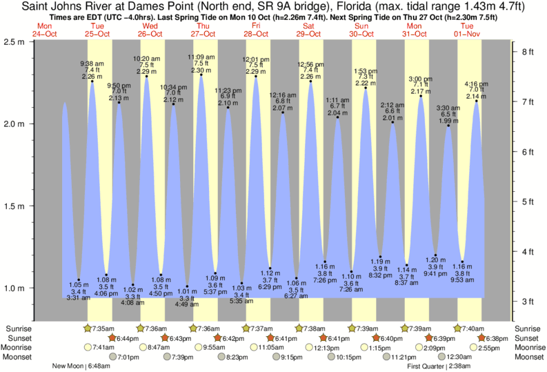 Tide chart for Saint Johns River at Dames Point (North end, SR 9A bridge)Showing low and high tide times for the next 30 days at Saint Johns River at Dames Point (North end, SR 9A bridge). Tide Times are EST (UTC -5.0hrs).