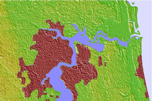 Use this relief map to navigate to tide stations, surf breaks and cities that are in the area of Saint Johns River at Long Branch, USCOE dredge depot, Florida.