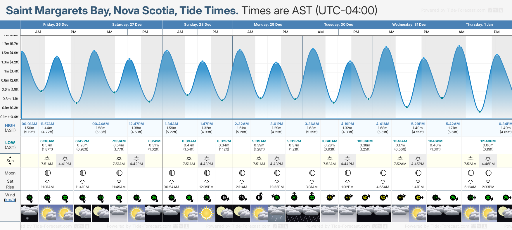 Tide chart for Saint Margarets BayShowing low and high tide times for the next 30 days at Saint Margarets Bay. Tide Times are AST (UTC -4.0hrs).