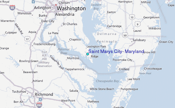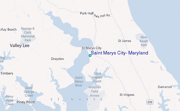 Use this relief map to navigate to tide stations, surf breaks and cities that are in the area of Saint Marys City, Maryland.