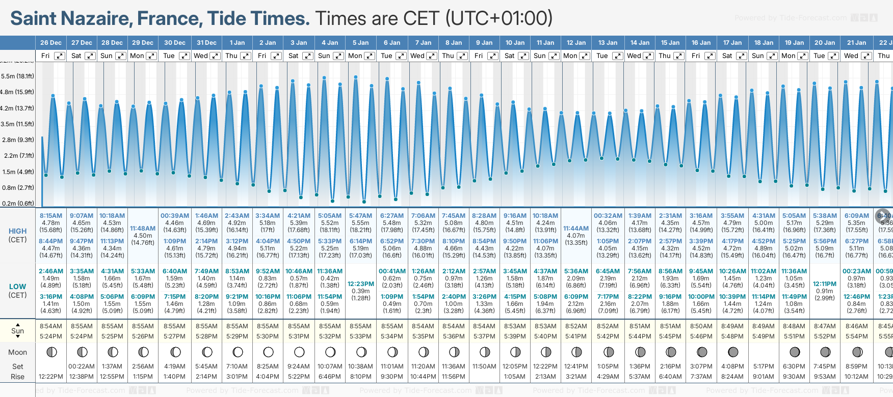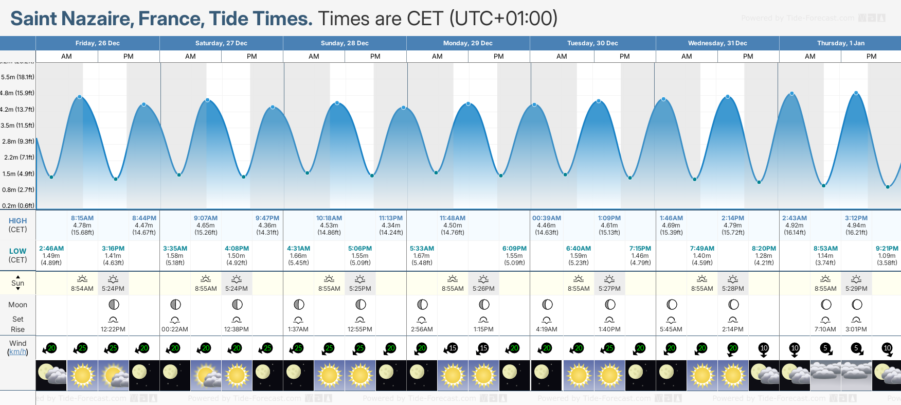 December and January Tide charts for Saint Nazaire: The tide charts below show the height, time and date of high and low tides for the next 30 days.