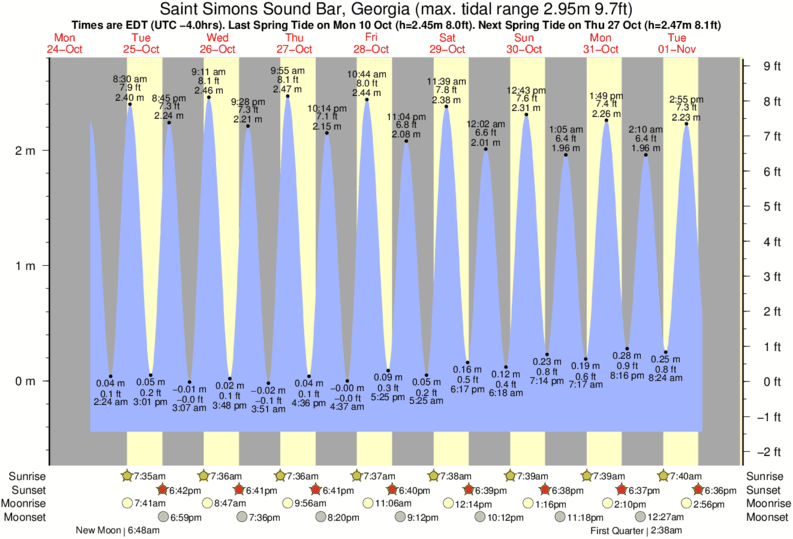 Tide Times are EST (UTC -5.0hrs). Last Spring High Tide at Saint Simons Sound Bar was on Sat 20 Dec (height: 2.11m 6.9ft). Next high Spring Tide at Saint Simons Sound Bar will be on Sat 03 Jan (height: 2.38m 7.8ft).