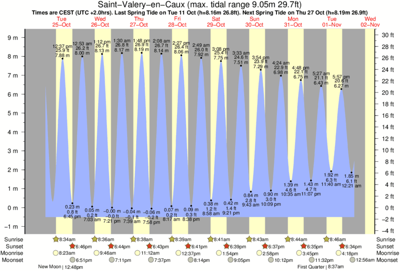 Tide chart for Saint-Valery-en-CauxShowing low and high tide times for the next 30 days at Saint-Valery-en-Caux. Tide Times are CET (UTC +1.0hrs).