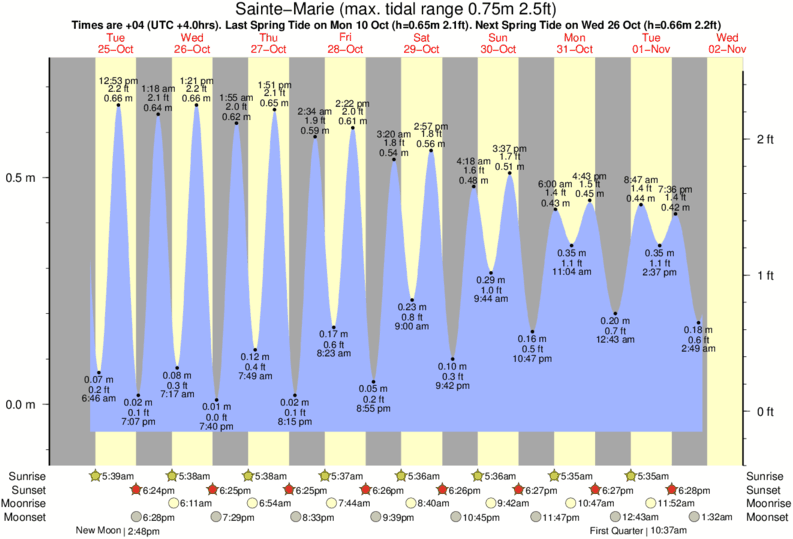 Tide Times are +04 (UTC +4.0hrs). Last Spring High Tide at Sainte-Marie was on Thu 04 Dec (height: 0.65m 2.1ft). Next high Spring Tide at Sainte-Marie will be on Sun 21 Dec (height: 0.57m 1.9ft).