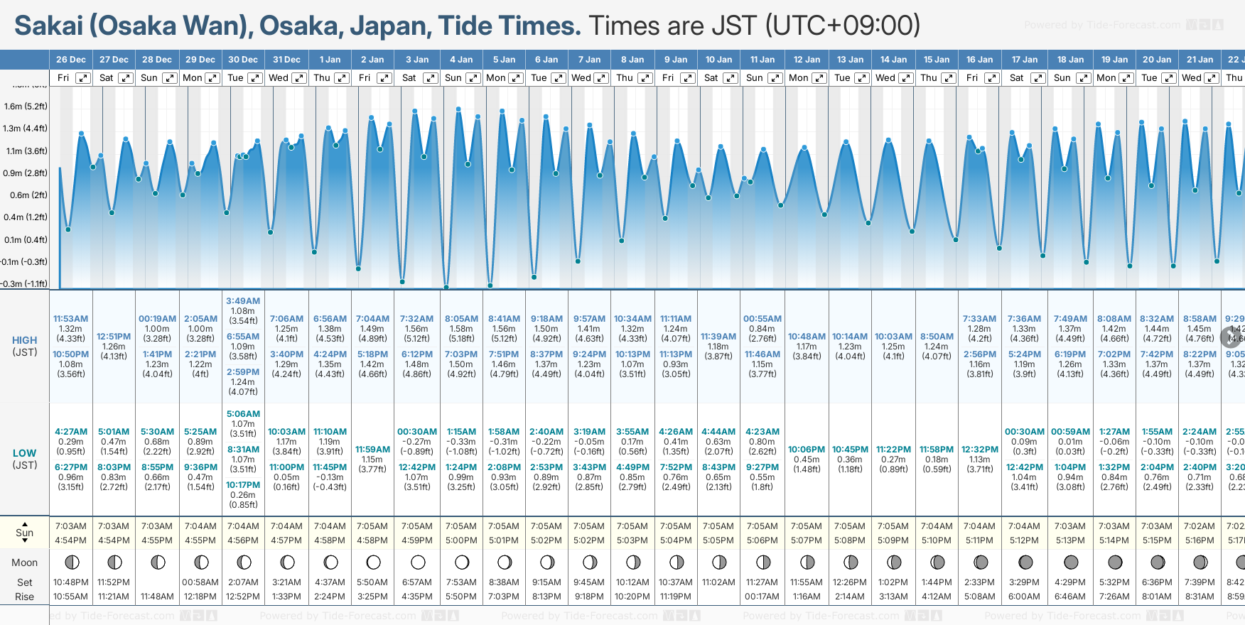 Tide Times are JST (UTC +9.0hrs). Last Spring High Tide at Sakai (Osaka Wan) was on Mon 22 Dec (height: 1.49m 4.9ft). Next high Spring Tide at Sakai (Osaka Wan) will be on Sun 04 Jan (height: 1.58m 5.2ft).