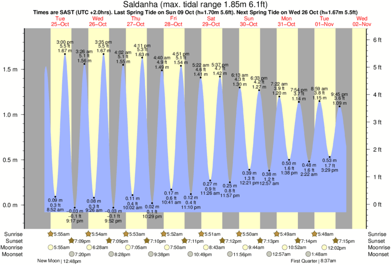 Tide Times are SAST (UTC +2.0hrs). Last Spring High Tide at Saldanha was on Thu 04 Dec (height: 1.65m 5.4ft). Next high Spring Tide at Saldanha will be on Mon 22 Dec (height: 1.41m 4.6ft).