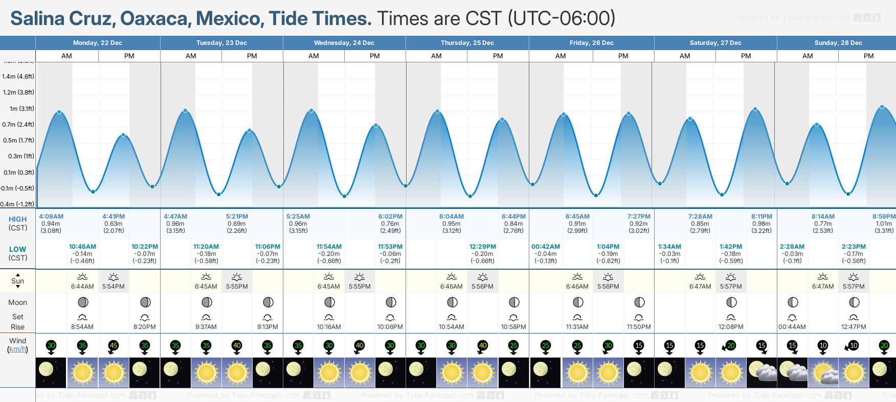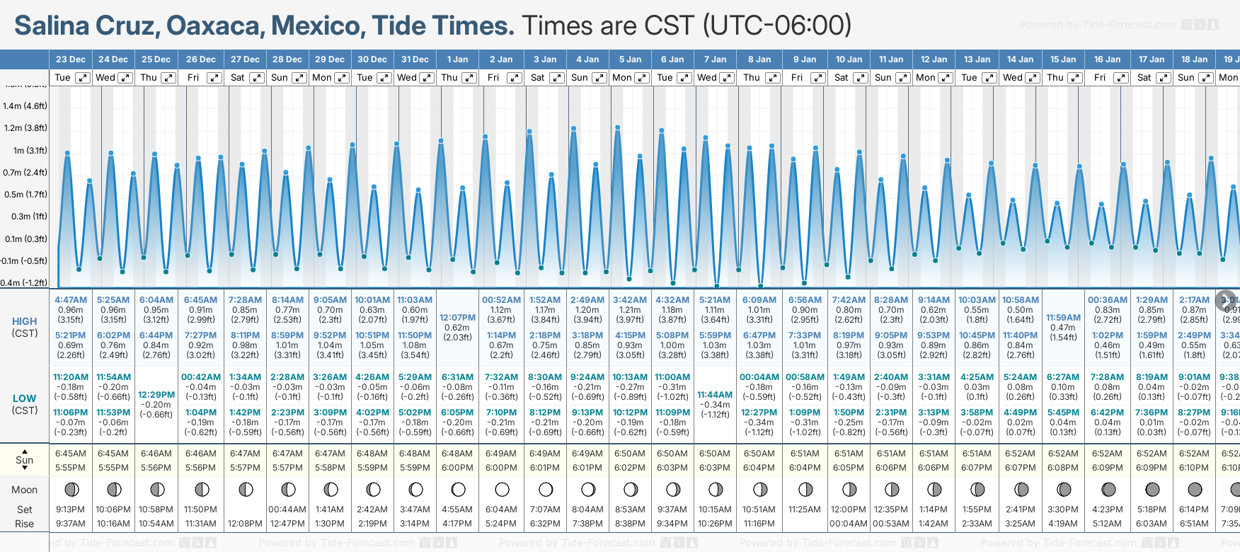 December and January Tide charts for Salina Cruz: The tide charts below show the height, time and date of high and low tides for the next 30 days.