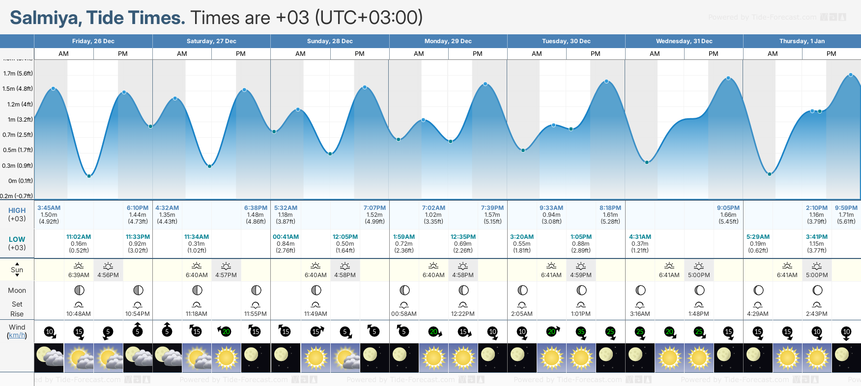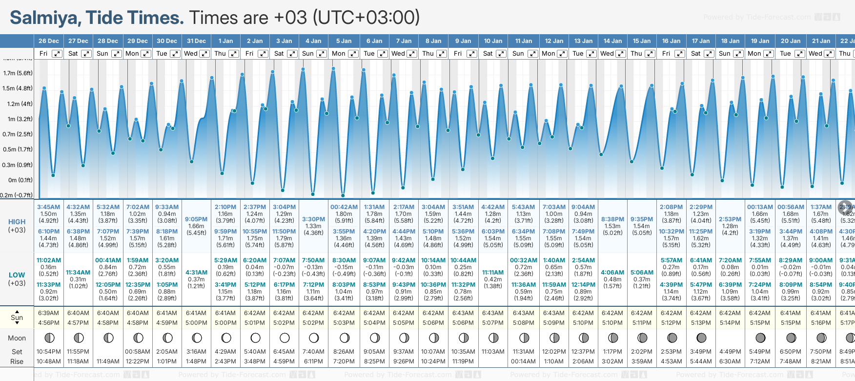 December and January Tide charts for Salmiya: The tide charts below show the height, time and date of high and low tides for the next 30 days.