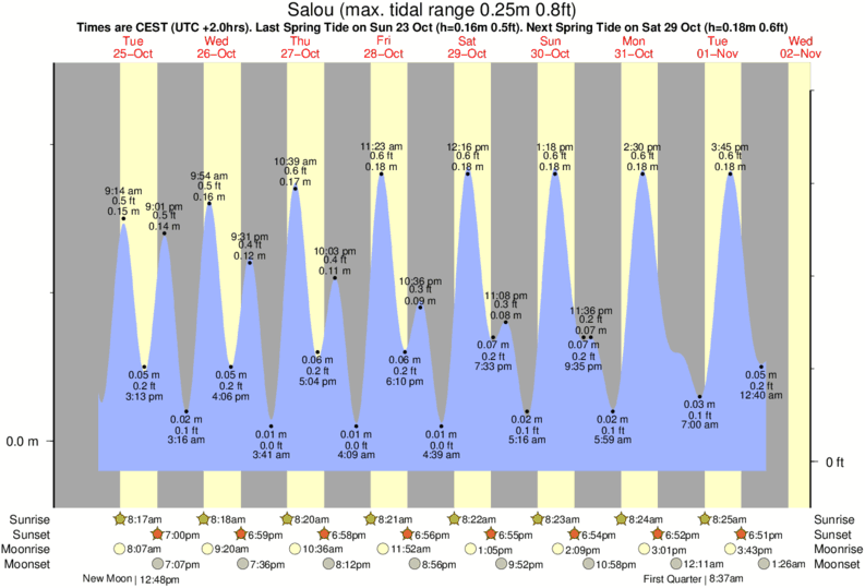 Tide Times are CET (UTC +1.0hrs). Last Spring High Tide at Salou was on Mon 08 Dec (height: 0.22m 0.7ft). Next high Spring Tide at Salou will be on Sun 21 Dec (height: 0.19m 0.6ft).