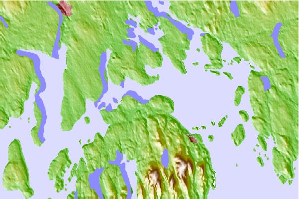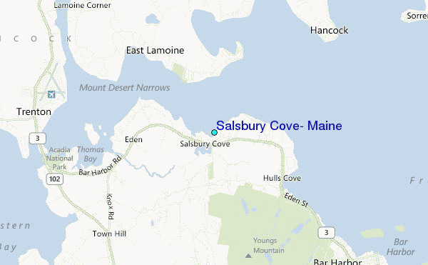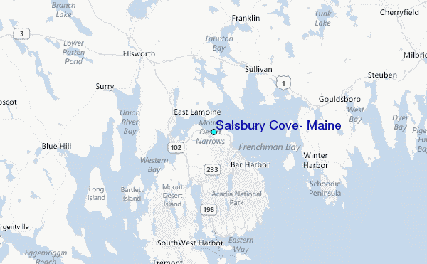Use this relief map to navigate to tide stations, surf breaks and cities that are in the area of Salsbury Cove, Maine.