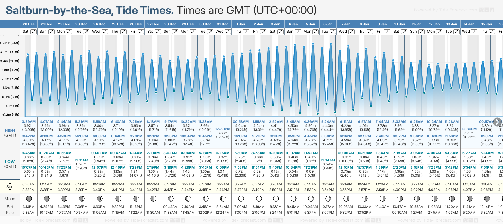 December and January Tide charts for Saltburn-by-the-Sea: The tide charts below show the height, time and date of high and low tides for the next 30 days.