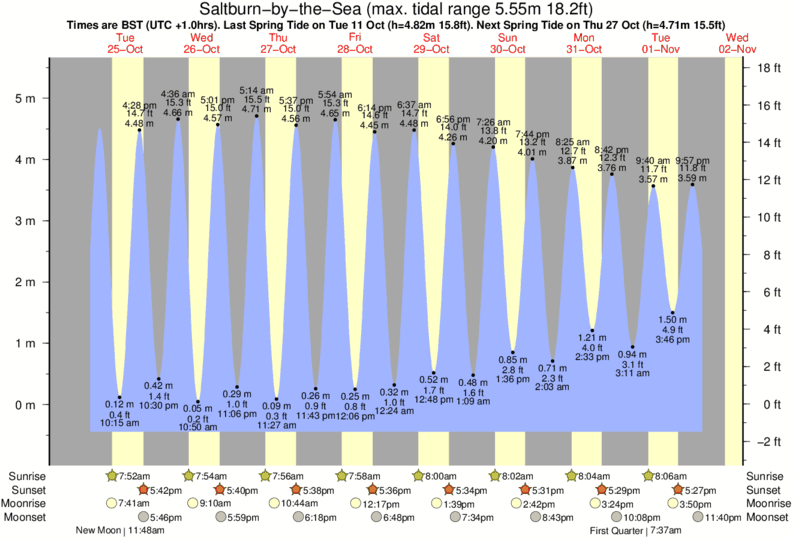 Tide Times are GMT (UTC +0hrs). Last Spring High Tide at Saltburn-by-the-Sea was on Sat 06 Dec (height: 4.71m 15.5ft). Next high Spring Tide at Saltburn-by-the-Sea will be on Tue 23 Dec (height: 4.22m 13.8ft).