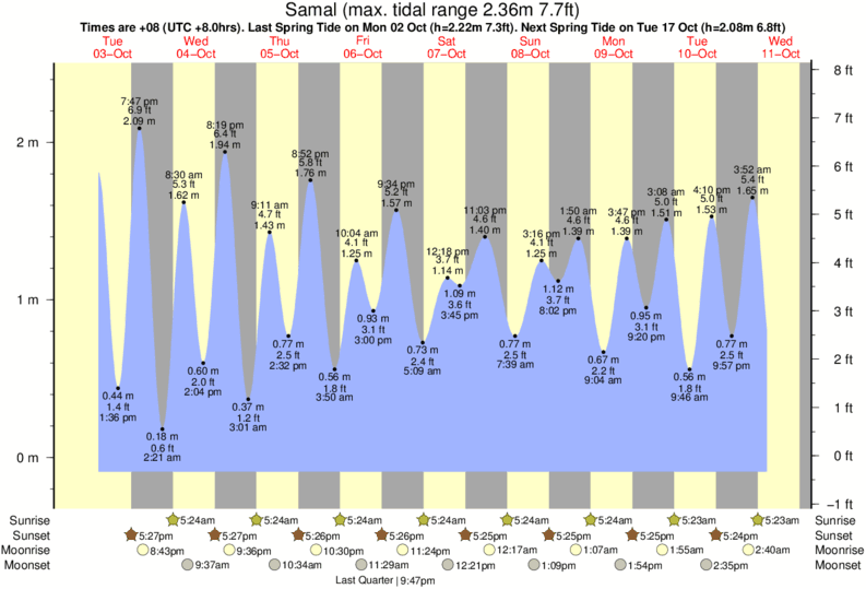 Tide Times are PST (UTC +8.0hrs). Last Spring High Tide at Samal was on Sun 07 Dec (height: 2.27m 7.4ft). Next high Spring Tide at Samal will be on Mon 22 Dec (height: 2.02m 6.6ft).
