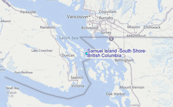 Use this relief map to navigate to tide stations, surf breaks and cities that are in the area of Samuel Island (South Shore), British Columbia.
