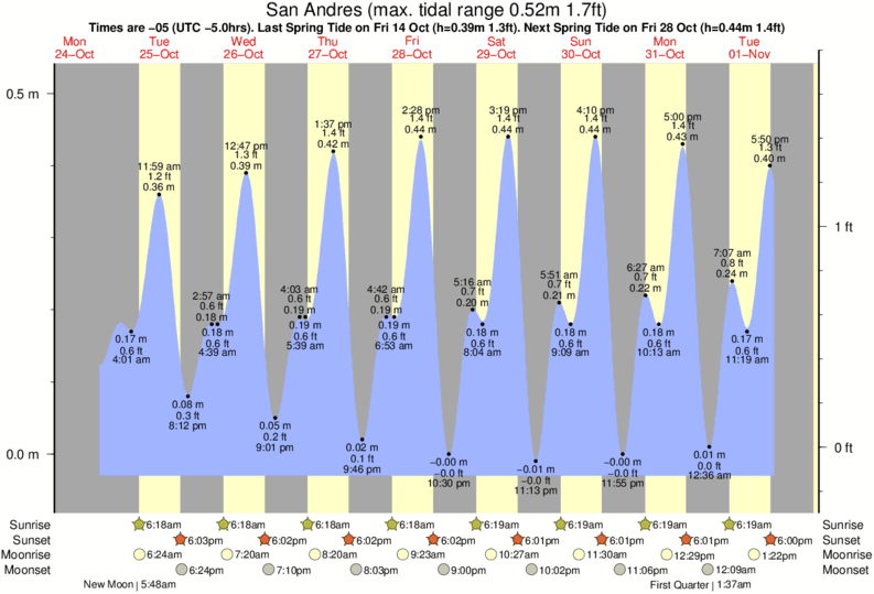 Tide Times are -05 (UTC -5.0hrs). Last Spring High Tide at San Andres was on Thu 18 Dec (height: 0.38m 1.2ft). Next high Spring Tide at San Andres will be on Thu 01 Jan (height: 0.48m 1.6ft).