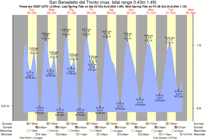 Tide Times are CET (UTC +1.0hrs). Last Spring High Tide at San Benedetto del Tronto was on Fri 05 Dec (height: 0.40m 1.3ft). Next high Spring Tide at San Benedetto del Tronto will be on Sat 20 Dec (height: 0.37m 1.2ft).