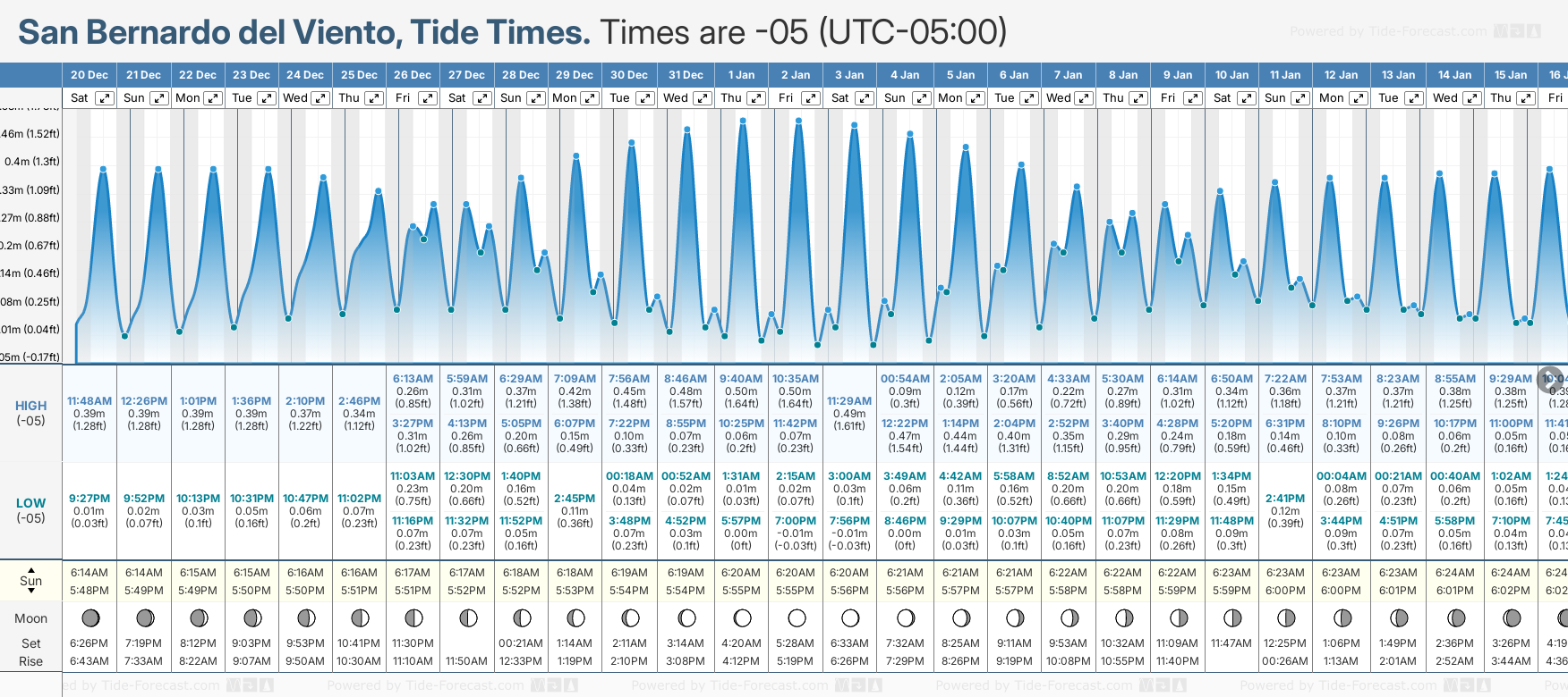 December and January Tide charts for San Bernardo del Viento: The tide charts below show the height, time and date of high and low tides for the next 30 days.