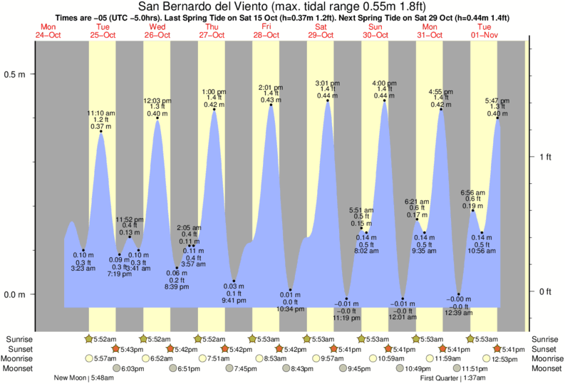 Tide Times are -05 (UTC -5.0hrs). Last Spring High Tide at San Bernardo del Viento was on Wed 17 Dec (height: 0.39m 1.3ft). Next high Spring Tide at San Bernardo del Viento will be on Thu 01 Jan (height: 0.50m 1.6ft).