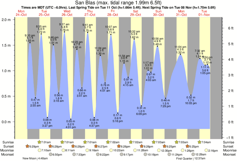 Tide Times are MST (UTC -7.0hrs). Last Spring High Tide at San Blas was on Fri 05 Dec (height: 1.84m 6.0ft). Next high Spring Tide at San Blas will be on Sun 21 Dec (height: 1.65m 5.4ft).
