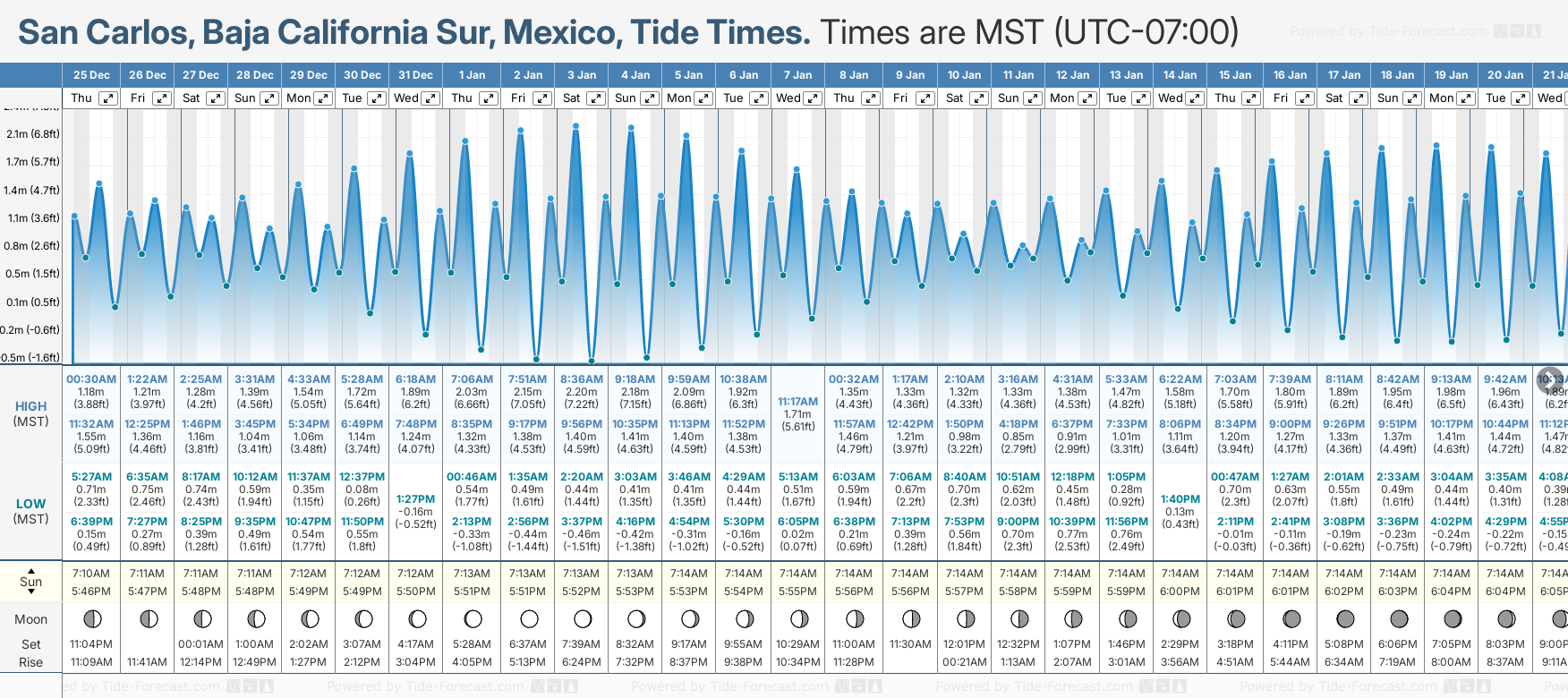 Tide Times are MST (UTC -7.0hrs). Last Spring High Tide at San Carlos was on Sat 20 Dec (height: 1.93m 6.3ft). Next high Spring Tide at San Carlos will be on Sat 03 Jan (height: 2.20m 7.2ft).