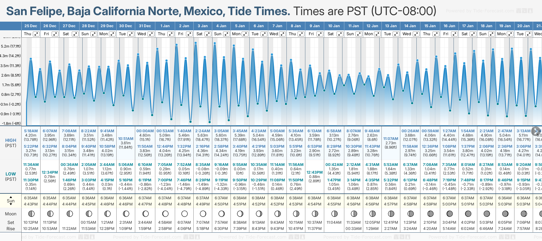 Tide Times are PST (UTC -8.0hrs). Last Spring High Tide at San Felipe was on Sat 20 Dec (height: 4.70m 15.4ft). Next high Spring Tide at San Felipe will be on Fri 02 Jan (height: 5.63m 18.5ft).