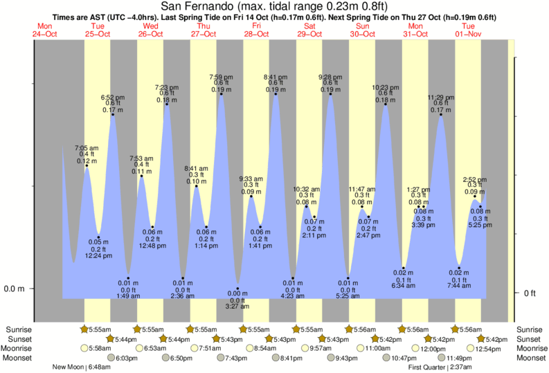 Tide Times are AST (UTC -4.0hrs). Last Spring High Tide at San Fernando was on Thu 18 Dec (height: 0.19m 0.6ft). Next high Spring Tide at San Fernando will be on Fri 02 Jan (height: 0.22m 0.7ft).