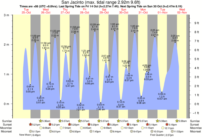 Tide Times are PST (UTC +8.0hrs). Last Spring High Tide at San Jacinto was on Sun 07 Dec (height: 2.72m 8.9ft). Next high Spring Tide at San Jacinto will be on Tue 23 Dec (height: 2.41m 7.9ft).