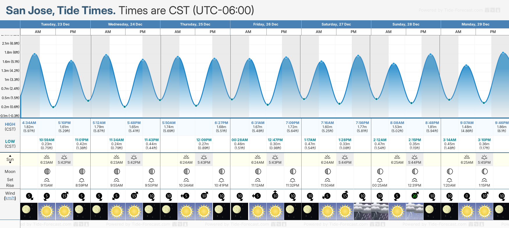 Tide chart for San JoseShowing low and high tide times for the next 30 days at San Jose. Tide Times are CST (UTC -6.0hrs).