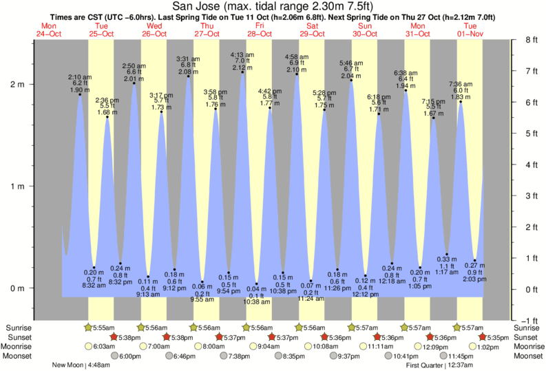 Tide Times are CST (UTC -6.0hrs). Last Spring High Tide at San Jose was on Fri 05 Dec (height: 2.20m 7.2ft). Next high Spring Tide at San Jose will be on Sat 20 Dec (height: 1.84m 6.0ft).