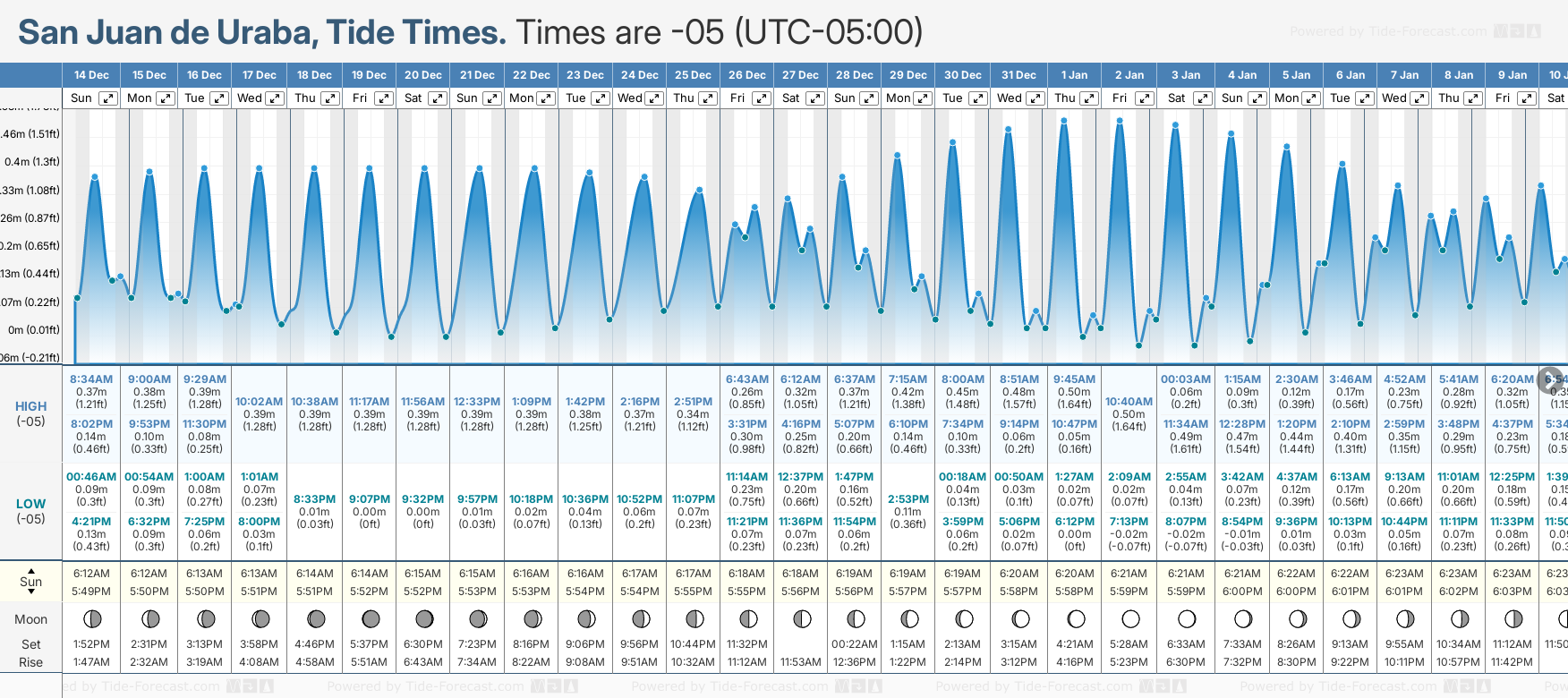 December and January Tide charts for San Juan de Uraba: The tide charts below show the height, time and date of high and low tides for the next 30 days.