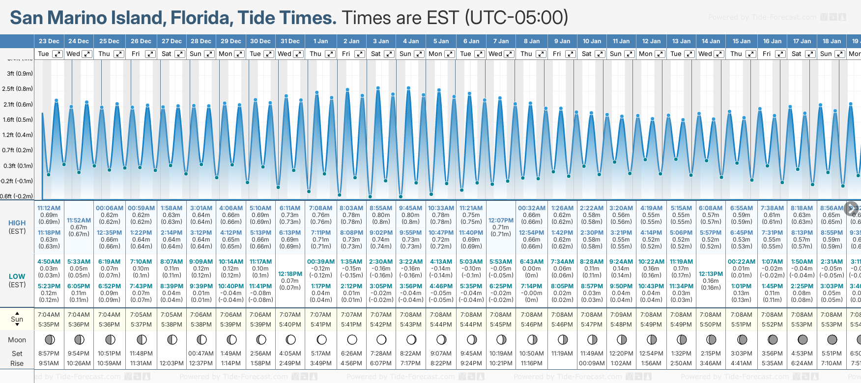 Tide Times are EST (UTC -5.0hrs). Last Spring High Tide at San Marino Island was on Sat 20 Dec (height: 0.72m 2.4ft). Next high Spring Tide at San Marino Island will be on Sat 03 Jan (height: 0.80m 2.6ft).