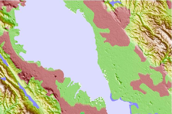 Use this relief map to navigate to tide stations, surf breaks and cities that are in the area of San Mateo Bridge (East), California.