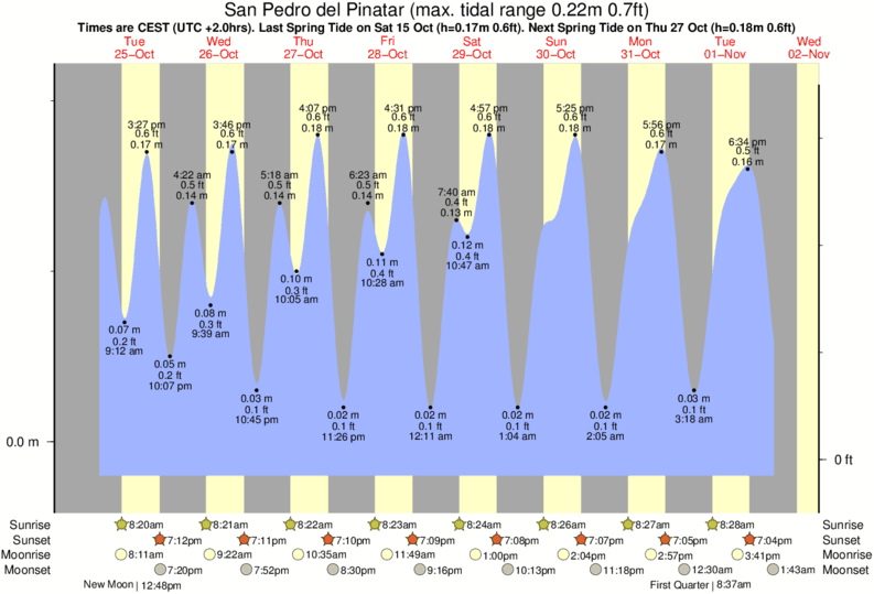 Tide chart for San Pedro del PinatarShowing low and high tide times for the next 30 days at San Pedro del Pinatar. Tide Times are CET (UTC +1.0hrs).