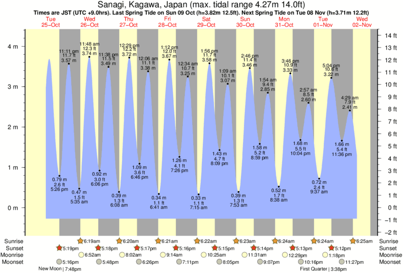 Sanagi tide chart key: The tide chart above shows the height and times of high tide and low tide for Sanagi, Kagawa, Japan. The grey shading corresponds to nighttime hours between sunset and sunrise at Sanagi.