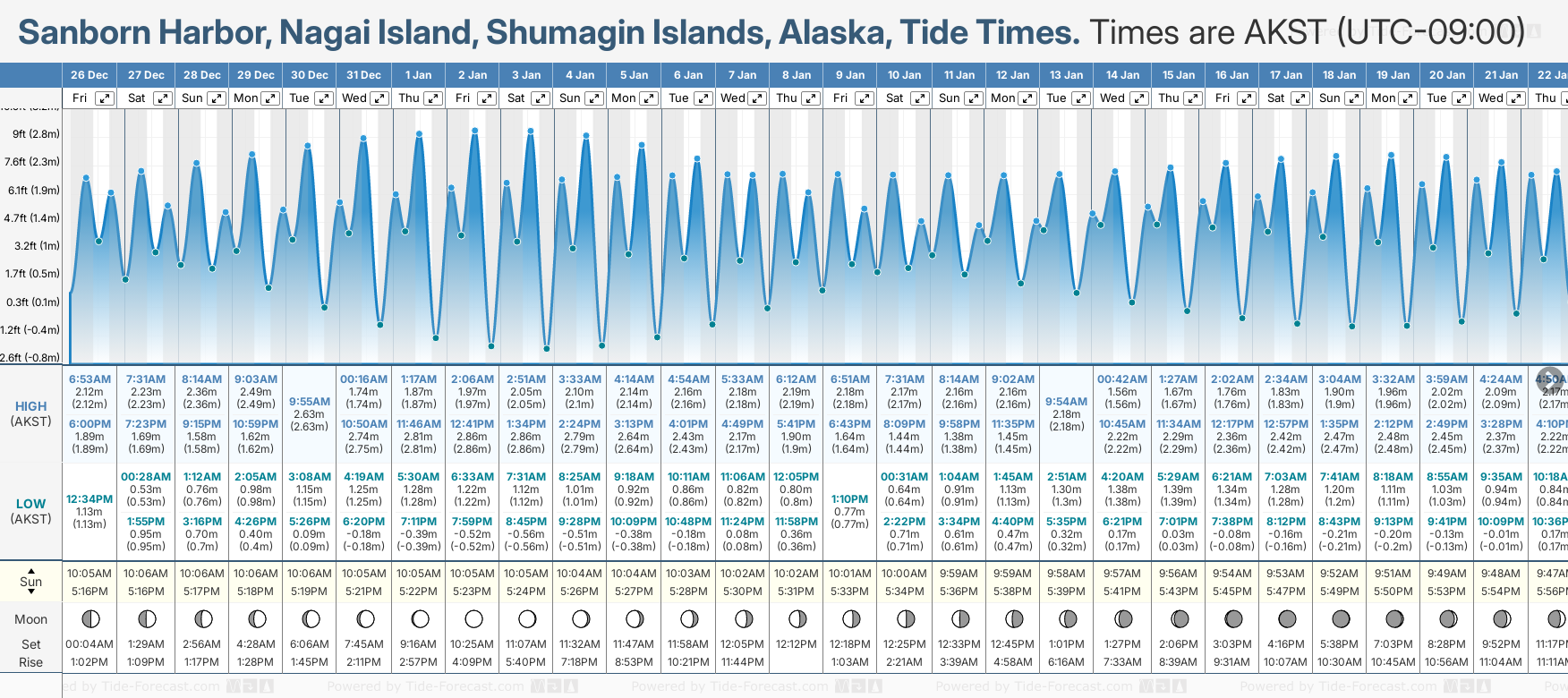December and January Tide charts for Sanborn Harbor, Nagai Island, Shumagin Islands: The tide charts below show the height, time and date of high and low tides for the next 30 days.