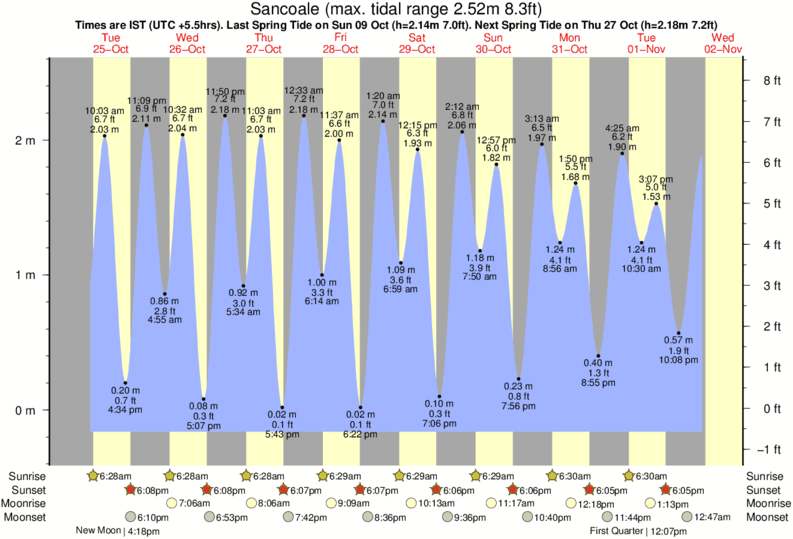 Tide chart for SancoaleShowing low and high tide times for the next 30 days at Sancoale. Tide Times are IST (UTC +5.5hrs).