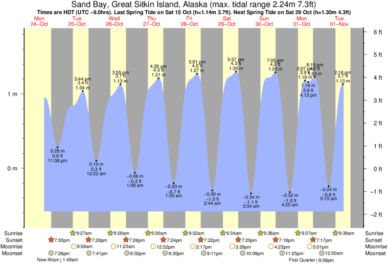 Tide chart for Sand Bay, Great Sitkin IslandShowing low and high tide times for the next 30 days at Sand Bay, Great Sitkin Island. Tide Times are HST (UTC -10.0hrs).