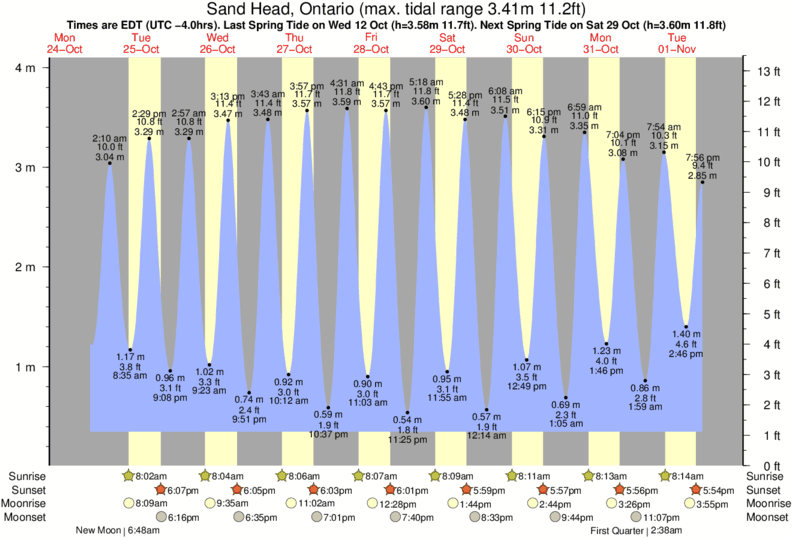 Sand Head tide chart key: The tide chart above shows the height and times of high tide and low tide for Sand Head, Ontario. The grey shading corresponds to nighttime hours between sunset and sunrise at Sand Head.