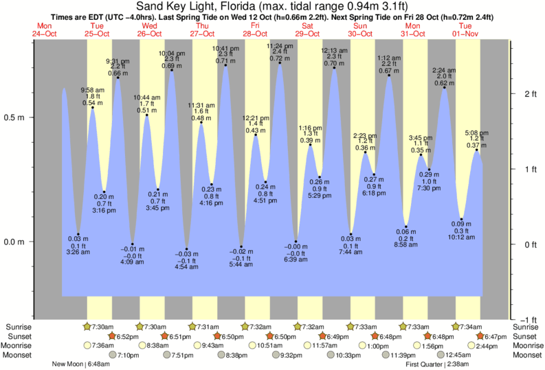 Tide Times are EST (UTC -5.0hrs). Last Spring High Tide at Sand Key Light was on Fri 05 Dec (height: 0.73m 2.4ft). Next high Spring Tide at Sand Key Light will be on Sat 20 Dec (height: 0.56m 1.8ft).