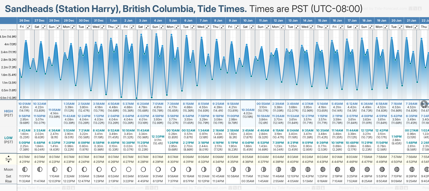 Tide Times are PST (UTC -8.0hrs). Last Spring High Tide at Sandheads (Station Harry) was on Mon 22 Dec (height: 4.51m 14.8ft). Next high Spring Tide at Sandheads (Station Harry) will be on Sat 03 Jan (height: 4.81m 15.8ft).