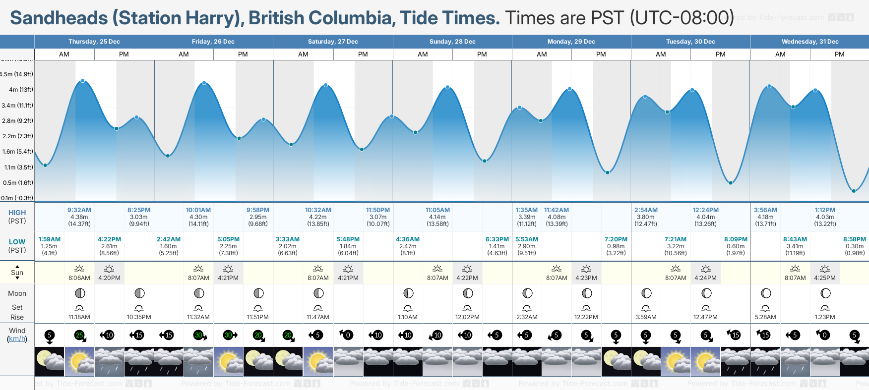 December and January Tide charts for Sandheads (Station Harry): The tide charts below show the height, time and date of high and low tides for the next 30 days.