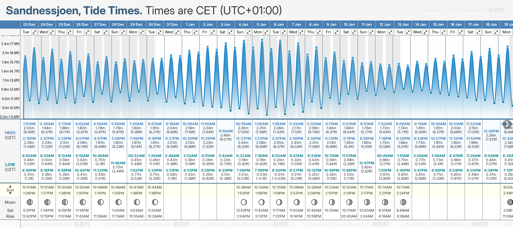 December and January Tide charts for Sandnessjoen: The tide charts below show the height, time and date of high and low tides for the next 30 days.