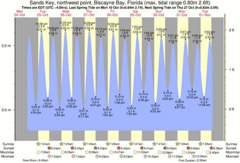Tide Times are EST (UTC -5.0hrs). Last Spring High Tide at Sands Key, northwest point, Biscayne Bay was on Fri 19 Dec (height: 0.47m 1.5ft). Next high Spring Tide at Sands Key, northwest point, Biscayne Bay will be on Sat 03 Jan (height: 0.53m 1.7ft).